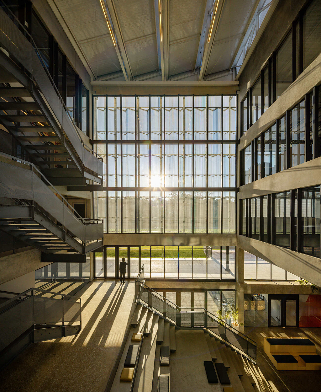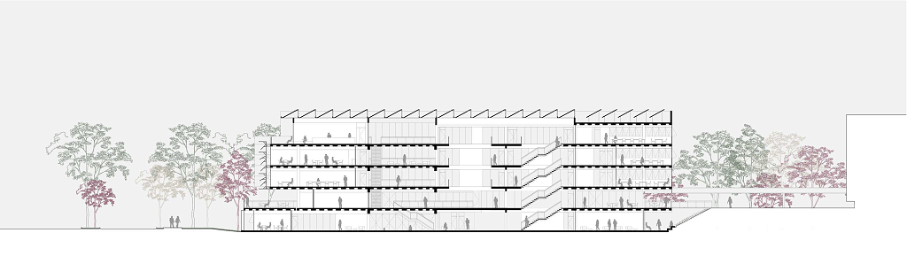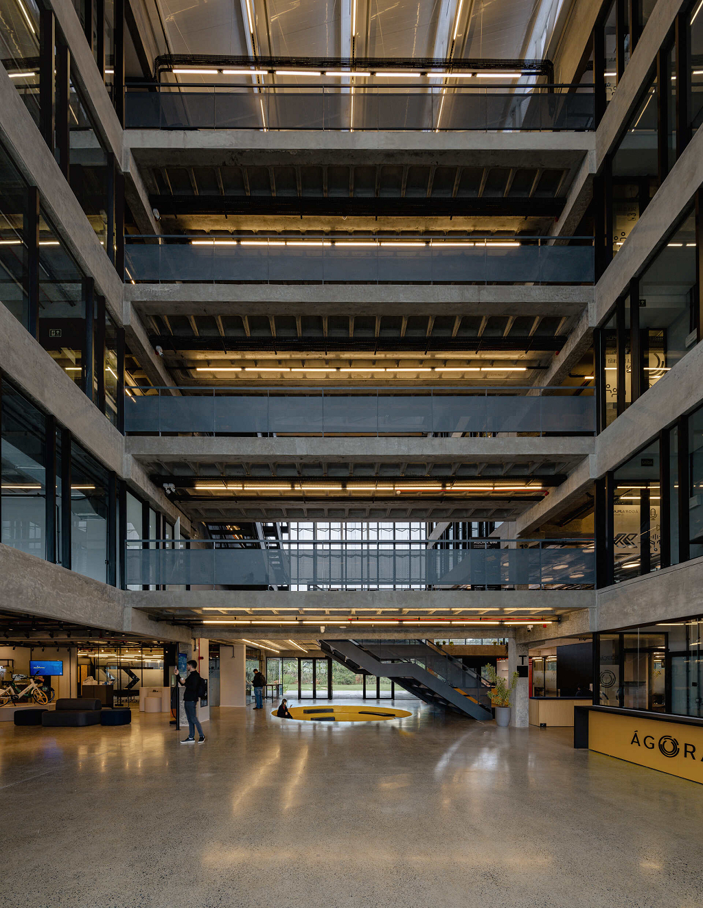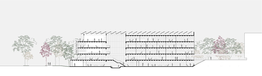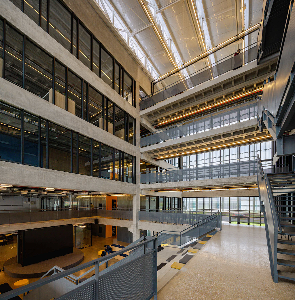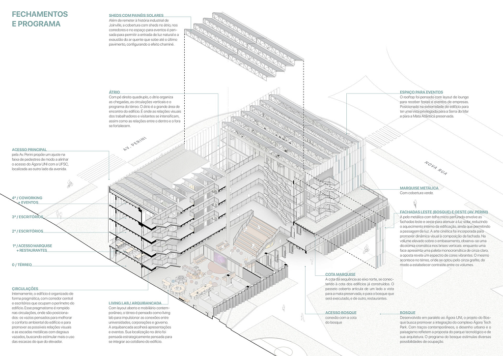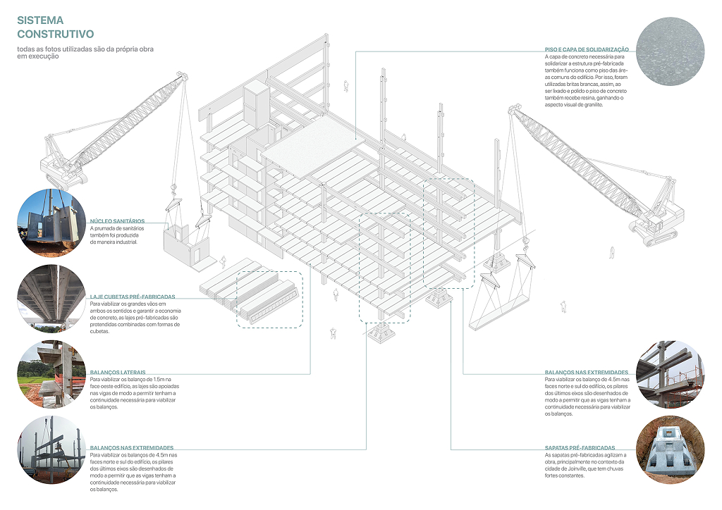 O átrio é a grande área de encontro do edifício. É onde as relações visuais dos trabalhadores e visitantes se intensificam. Todas as peças estruturais do edifício são pré-fabricadas, aliado ao uso de componentes construtivos industrializados em maior parte da edificação, o que permitirá uma obra rápida e parcialmente seca.