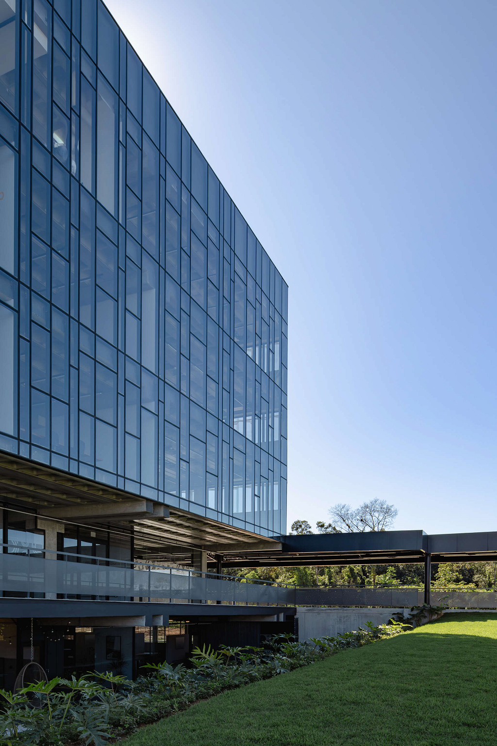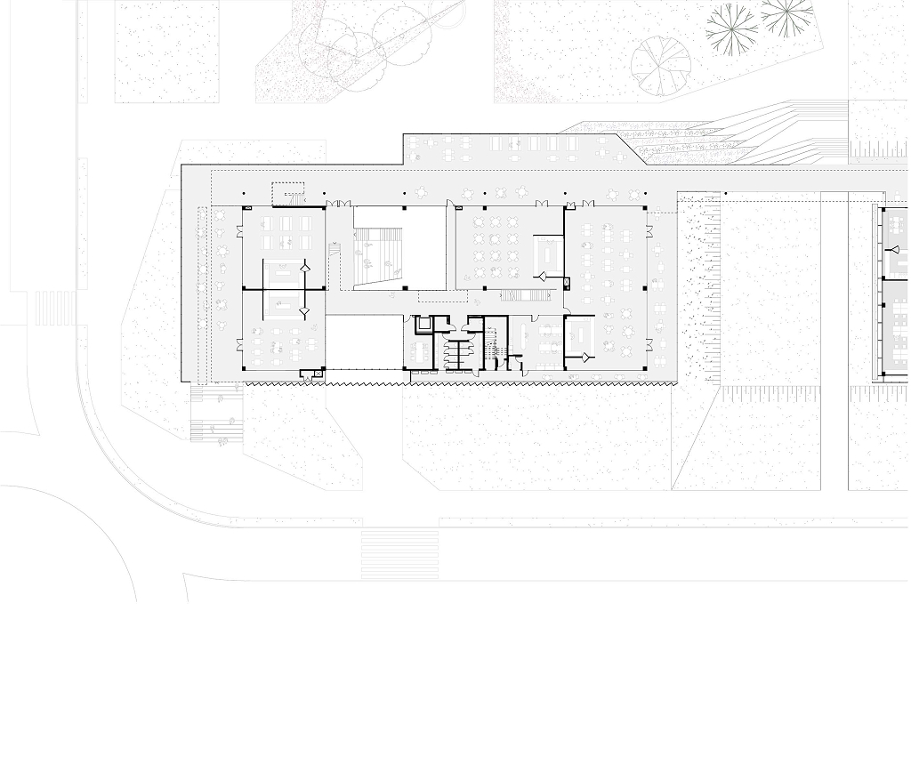 O passeio articula de um lado a vista para a mata preservada, e para o bosque que será executado, e de outro, restaurantes. Internamente, o edifício é organizado de forma pragmática, com corredor central e escritórios que ocupam o perímetro do edifício.
