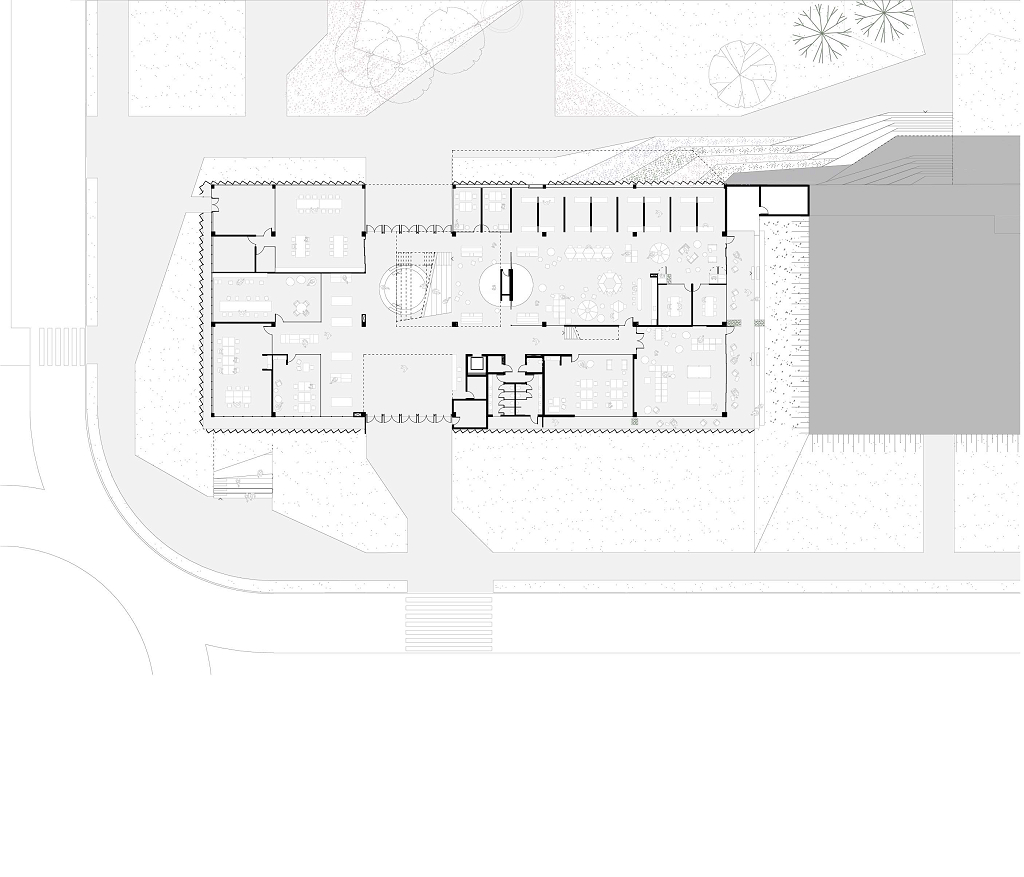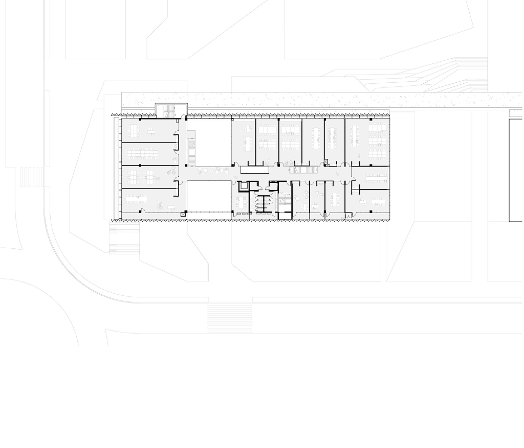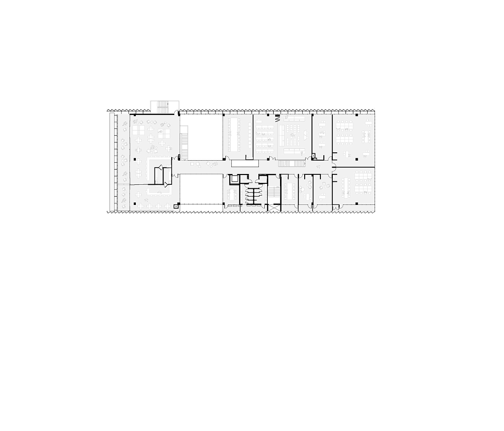A modulação é pensada para se adaptar a tamanhos diversos de salas. O pragmatismo extremo é rompido nas circulações, onde são posicionados vazios pensados para melhorar o conforto ambiental do edifício e para promover as possíveis relações visuais.