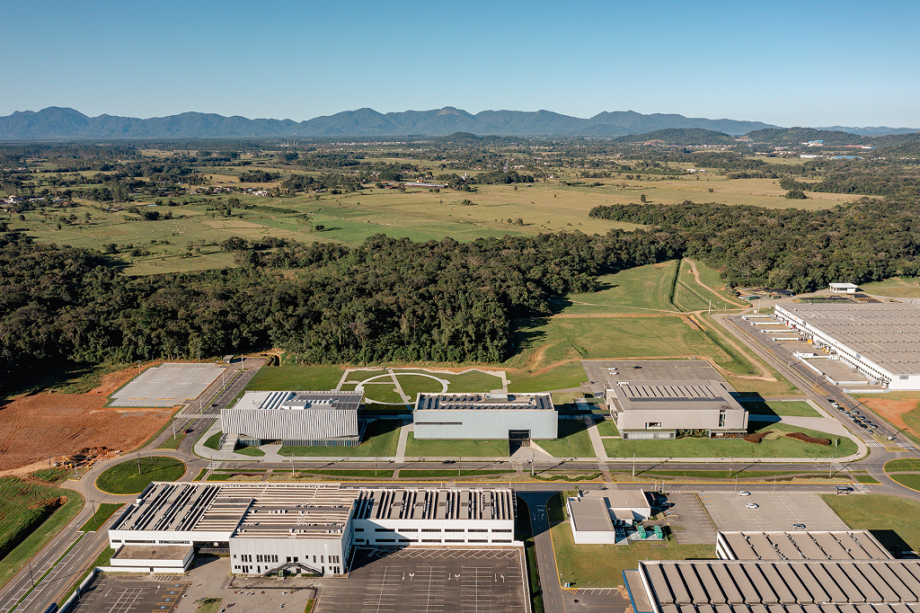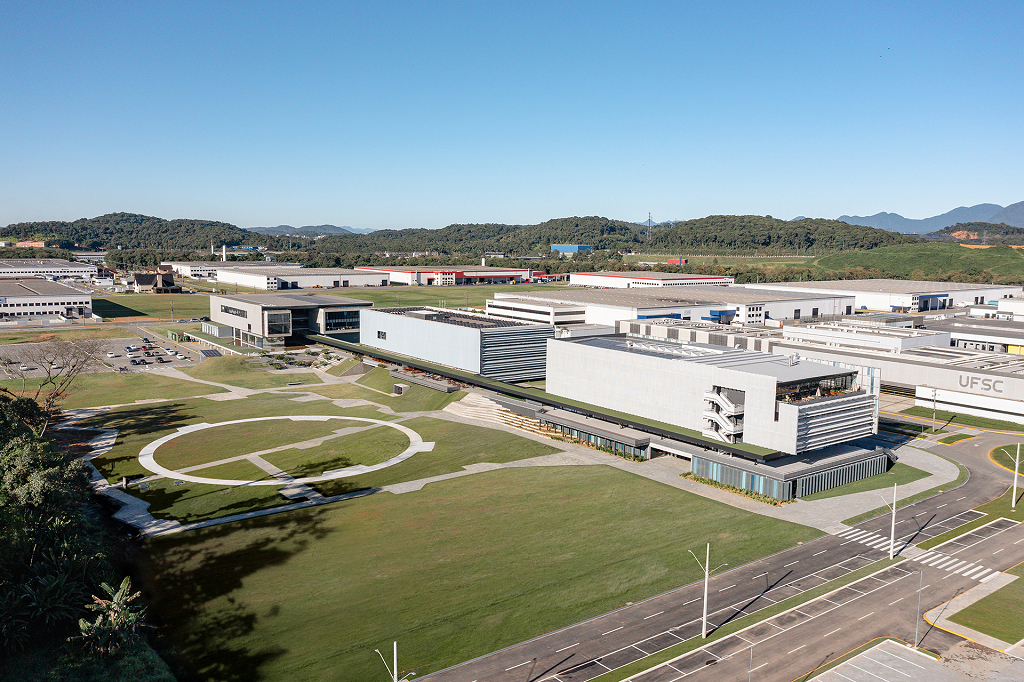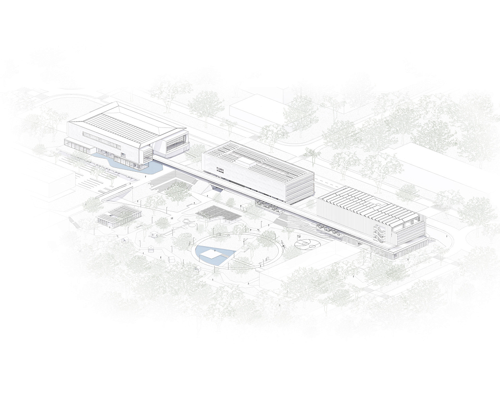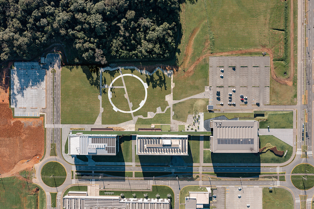 A implantação do Ágora UNI, terceiro edifício do Ágora Tech Park, articula duas cotas: o acesso principal pela Av. Perini, que permite acesso ao bosque. Nesse nível, o átrio com pé direito quadruplo organiza a chegada, as circulações verticais e programas do térreo; já na cota superior, o piso da marquise dá sequência ao eixo norte, se conectando à cota dos edifícios já construídos.