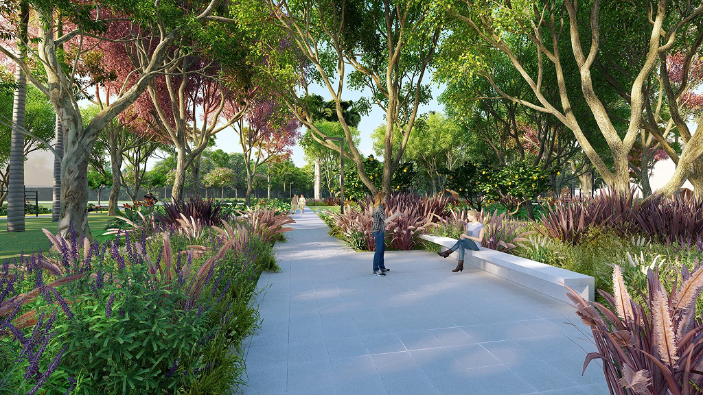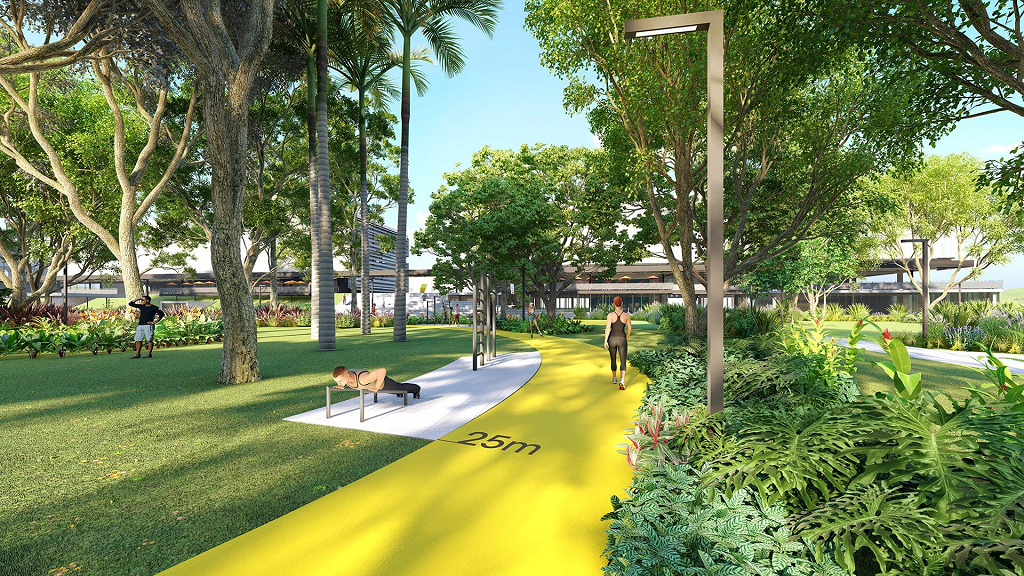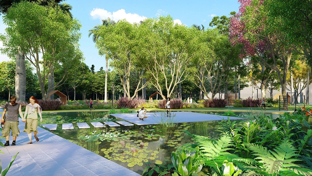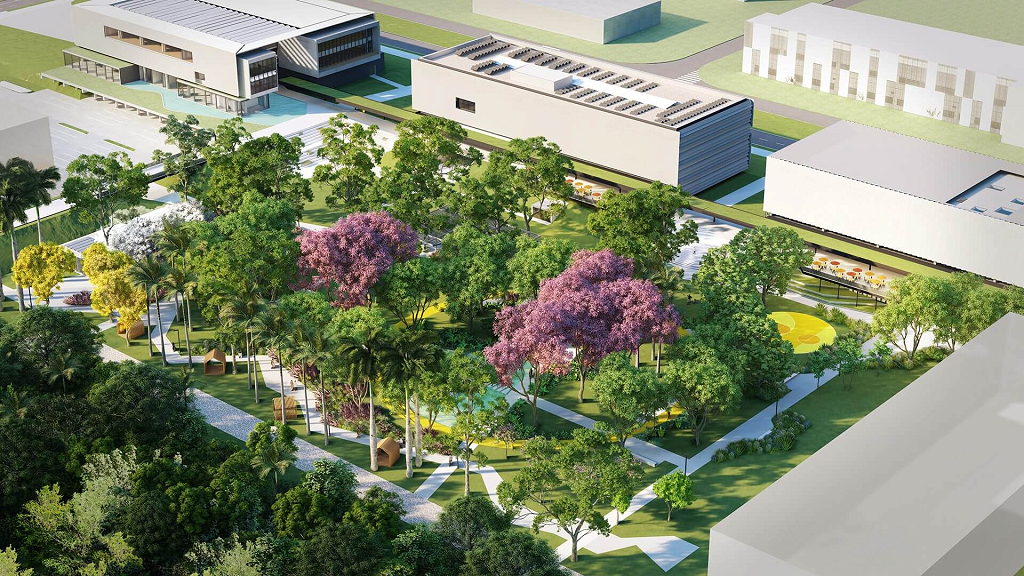 A organização do programa estimulas diversas possibilidades de ocupação, contemplação, descanso e exercícios físicos. Os caminhos foram organizados em eixos que conectam os pontos de acessos aos edifícios. Para tornar o passeio mais agradável, o desenho de piso apresenta sinuosidades e diagonais, aumentando a proximidade visual e sensorial em relação aos jardins. No paisagismo, a preferência foi dada às espécies adaptadas ao clima local. As árvores mais altas têm copas leves e vazadas. A composição é intercalada com árvores médias com cores importantes e espécies frutíferas, que atraem pássaros. O mobiliário tem traços limpos para não competirem com a vegetação nem com a arquitetura. Algumas peças foram especificadas e outras foram desenhadas, como o playground, que foi concebido para estimular a criatividade através do desenho abstrato, que não entrega a brincadeira pronta para as crianças. Essa intenção reflete a proposta do Ágora Tech Park de estimular a inovação e a criatividade.