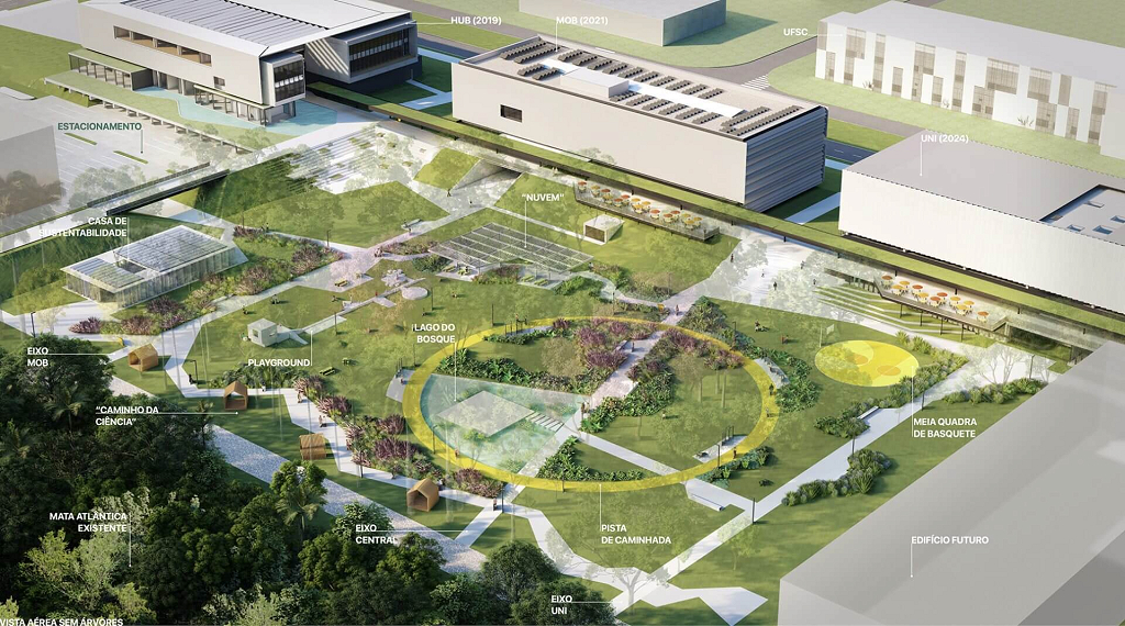 O Bosque busca promover a integração do Ágora Tech Park. Com traços contemporâneos, o desenho urbano e o paisagismo refletem a proposta do parque tecnológico e de sua arquitetura que acolhem diversos tipos de escritórios, restaurantes e eventos.