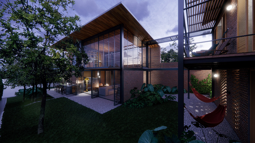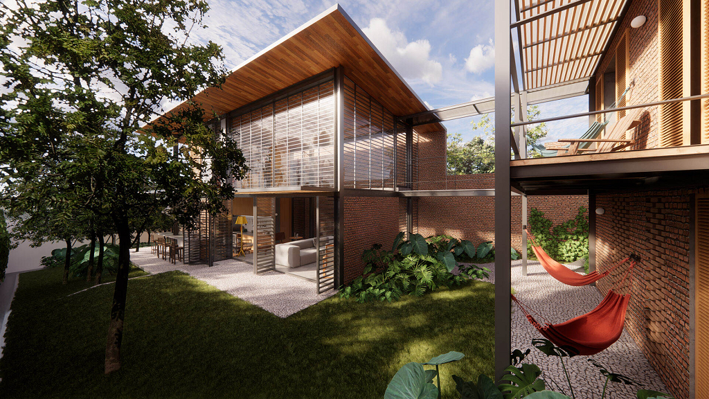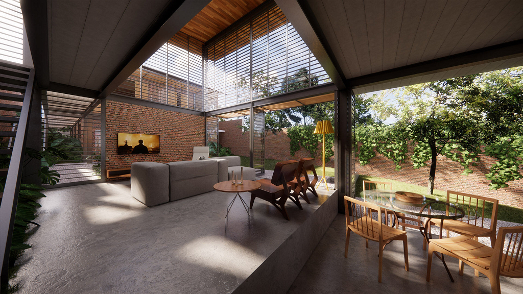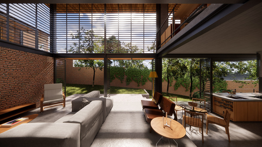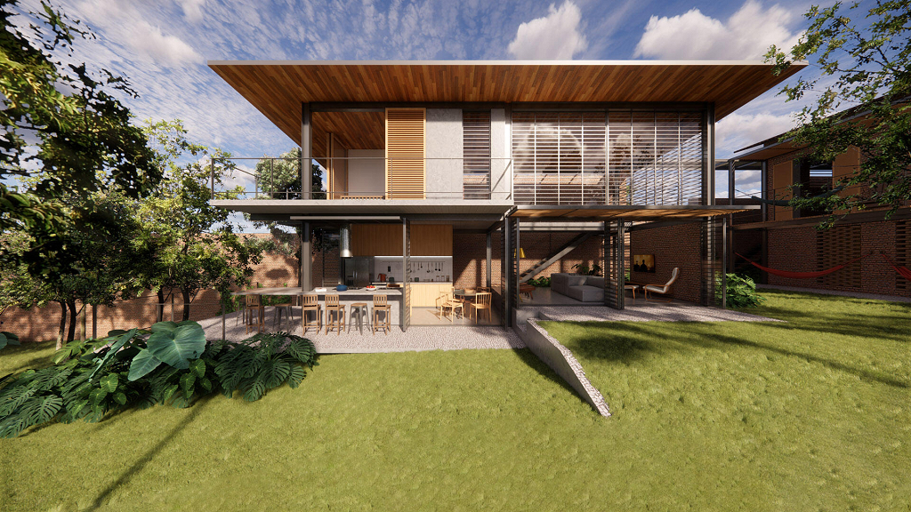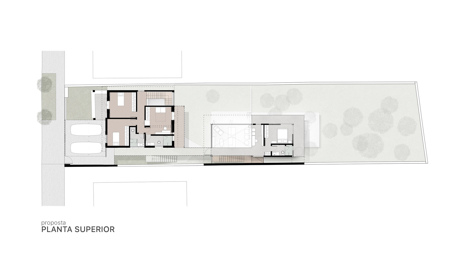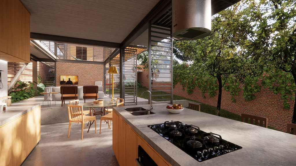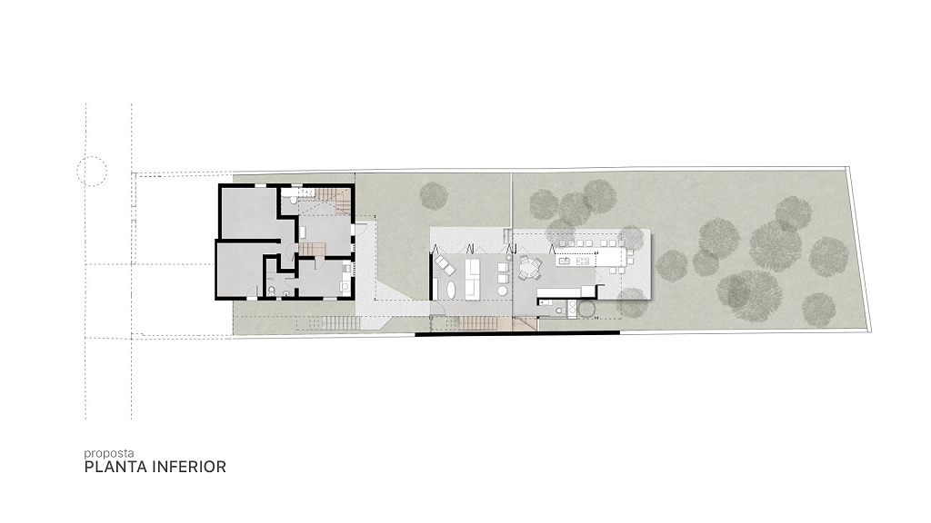 A casa existente será mais íntima, com quarto dos filhos, sala de atividades para as crianças que poderá ser convertido em quarto de hóspedes, lavanderia e depósito. O novo bloco acolhe o programa social, como estar, cozinha, escritório e suíte do casal.