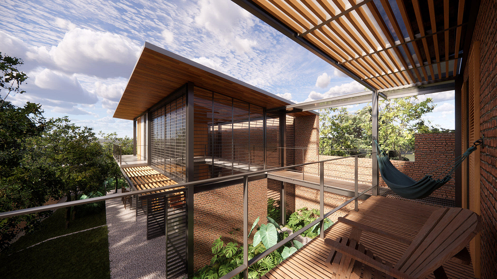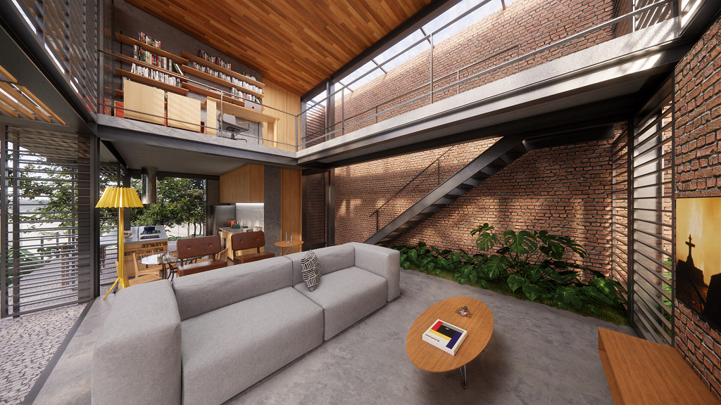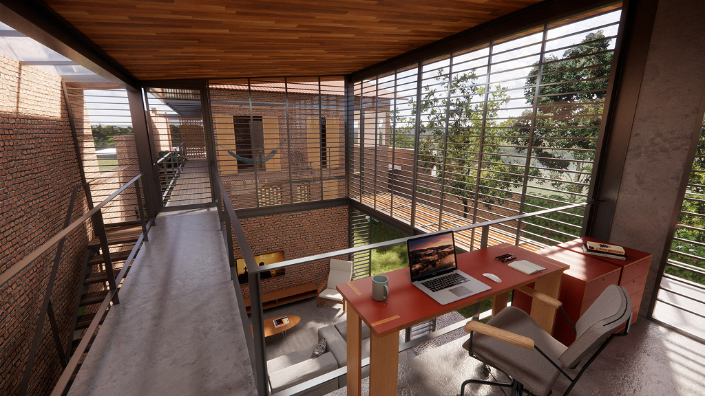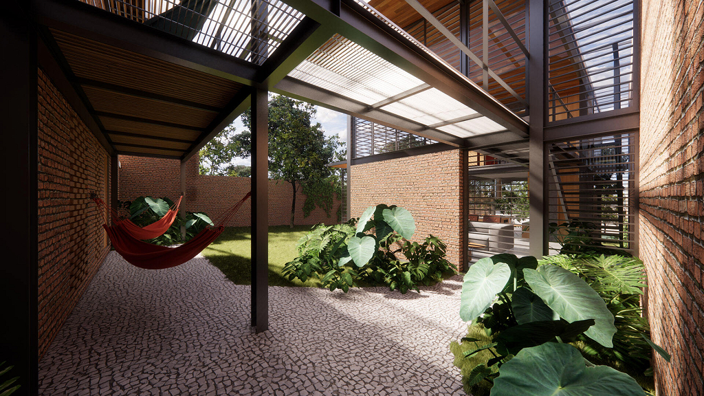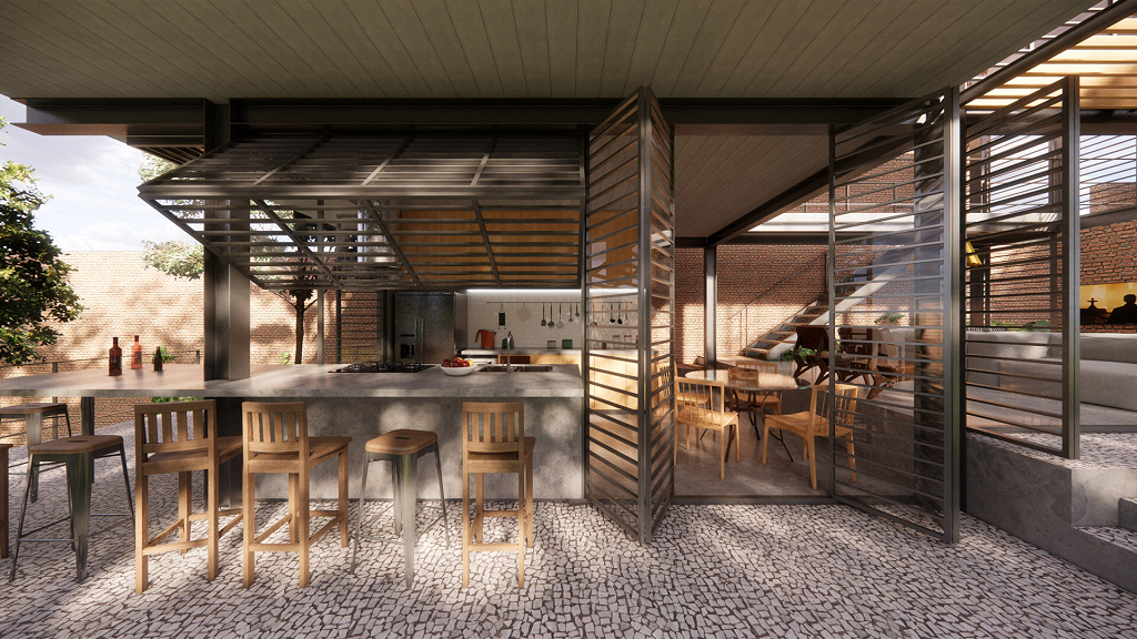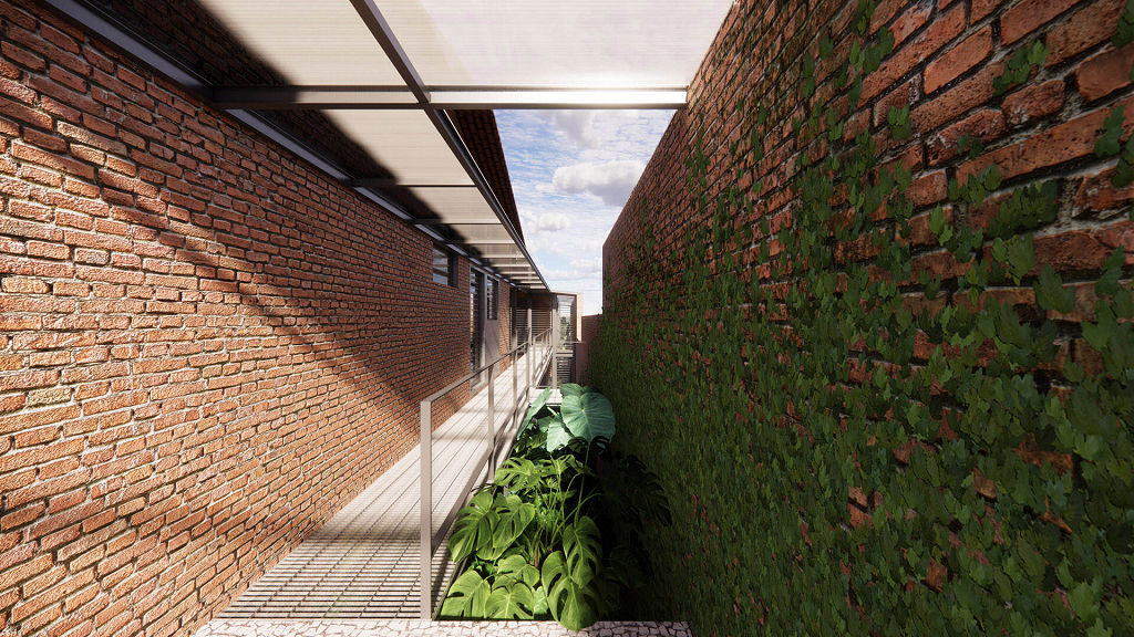 A conexão entre a edificação existente e a nova pode ser definida tanto pelo visual e materialidades (fechamentos em tijolos maciços) como também pelos novos elementos construídos (passarela e varanda).