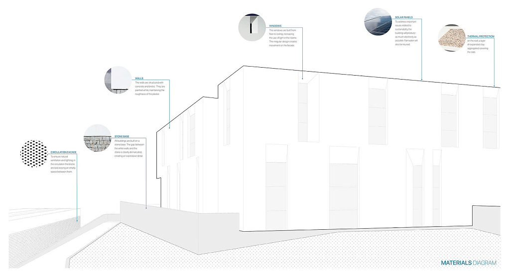 O edifício do alojamento (03) foi projetado de forma linear, com todos os quartos abrindo para a vista panorâmica. Além disso, o posicionamento fornece o sol da manhã a todos os dormitórios. A mesma lógica foi aplicada ao pavilhão administrativo, próximo ao armazém.