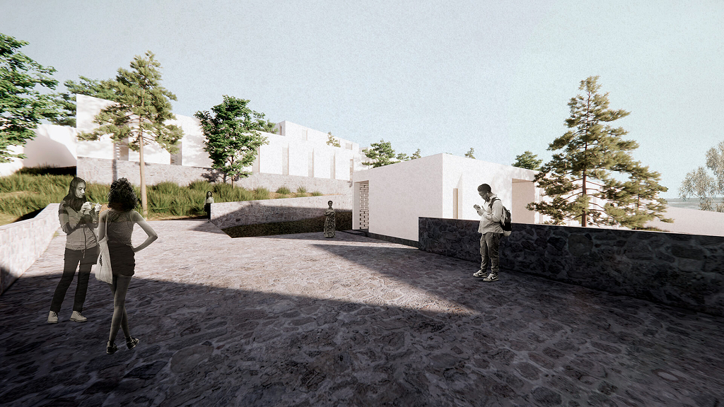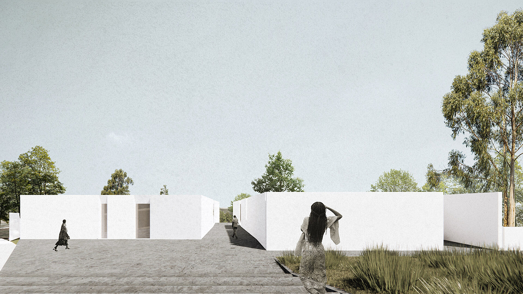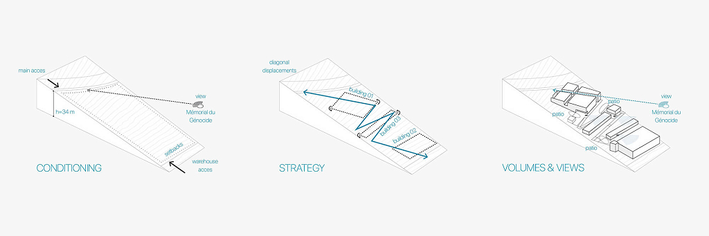 Partindo do acesso principal, uma diagonal rasga volumes e cria um passeio. A linha enquadra a paisagem e aponta para o Memorial do Genocídio de Kigali - a 300 metros do local.