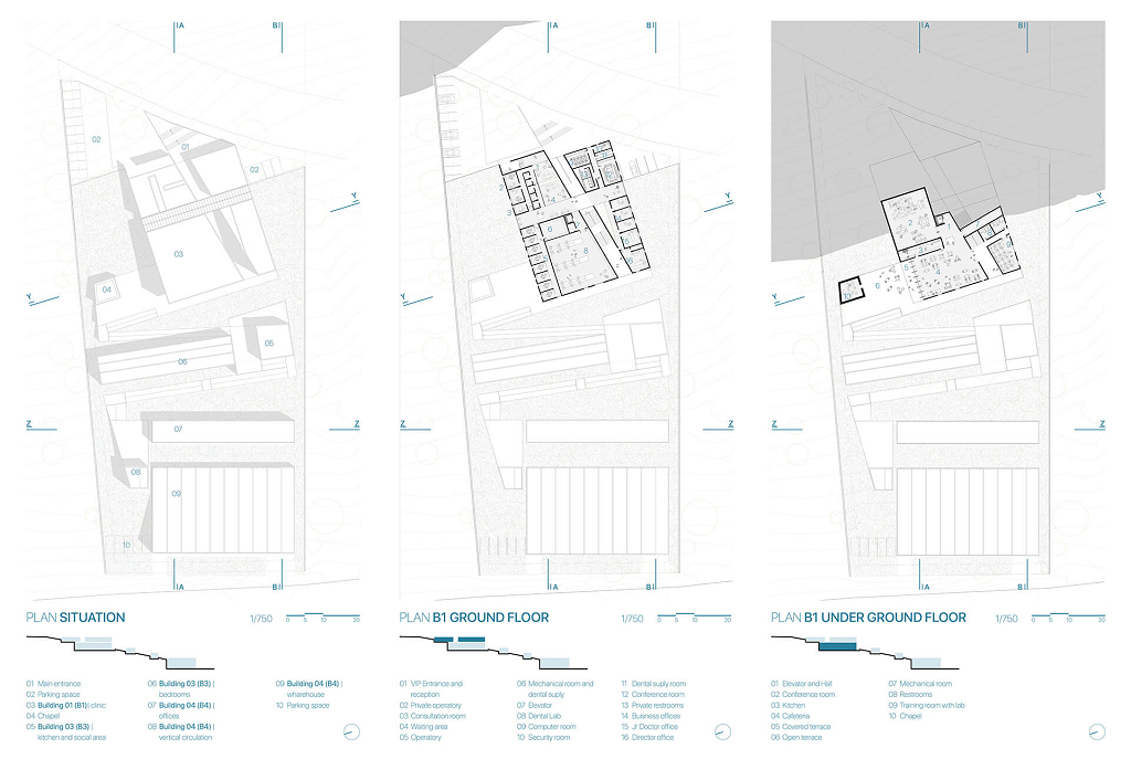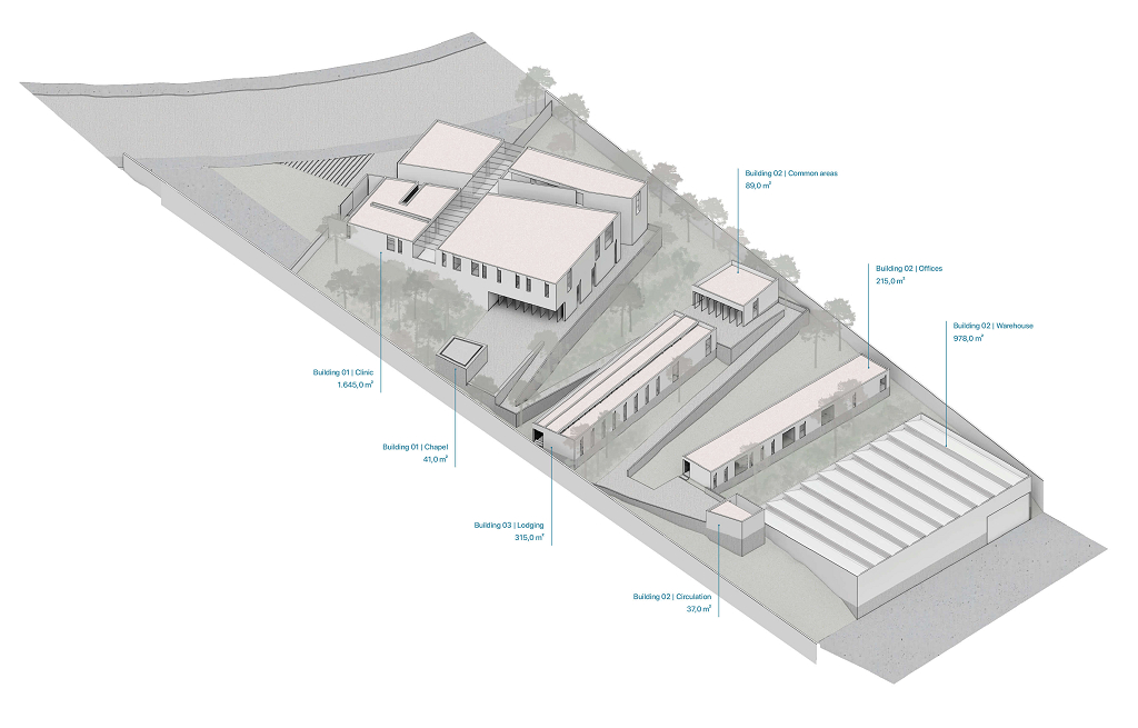 Próximo da nova via de acesso, o edifício 01 (clínica odontológica e centro de treinamento) possui um pátio generoso que articula as áreas sociais - cafeteria, sala de conferências e capela ecumênica. Reservada e segregada do volume principal, a capela possui geometria própria, feita apenas de pedra. Dessa forma, a quietude e a austeridade do espaço religioso são respeitadas.