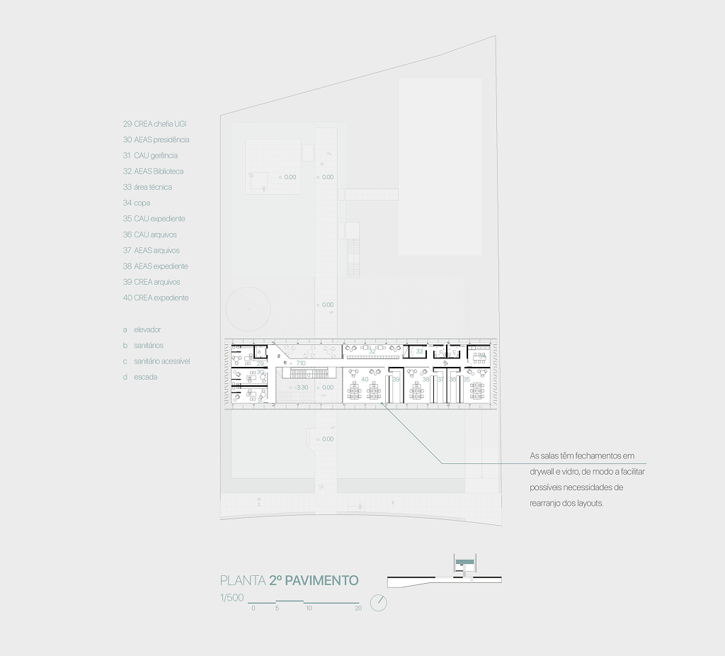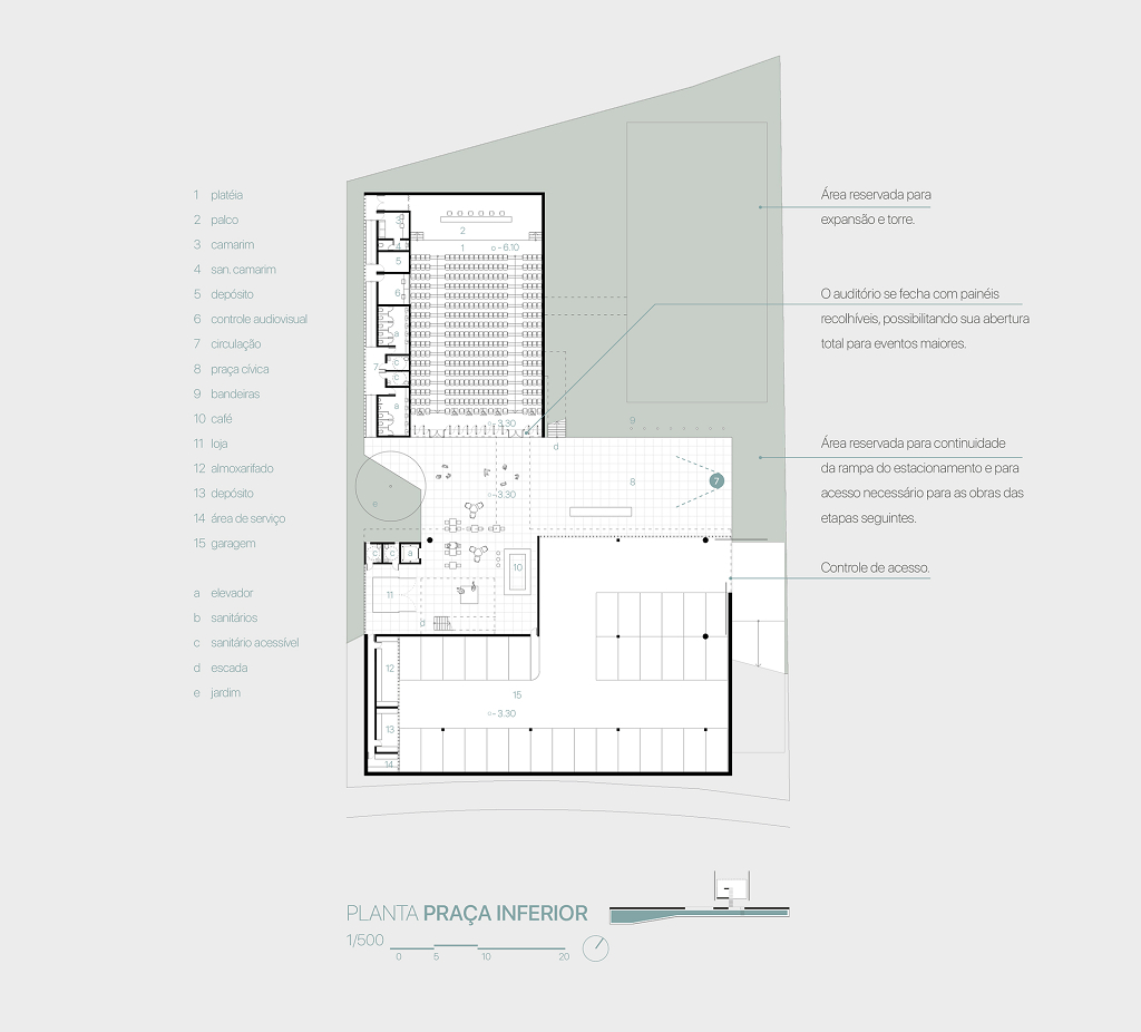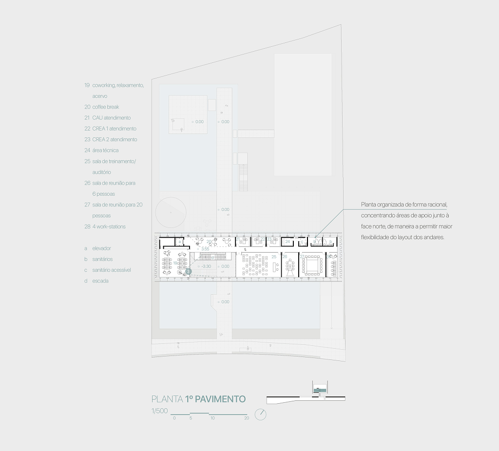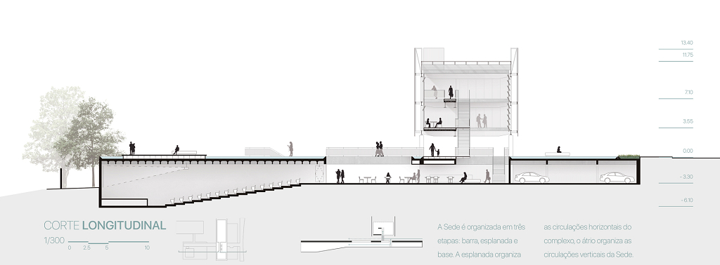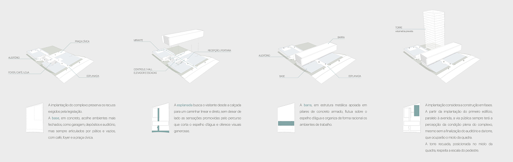 barra, esplanada e base. A barra, em estrutura metálica apoiada em pilares de concreto, flutua sobre o espelho d’água e organiza de forma racional os ambientes de trabalho. Na cota da cidade, a esplanada busca