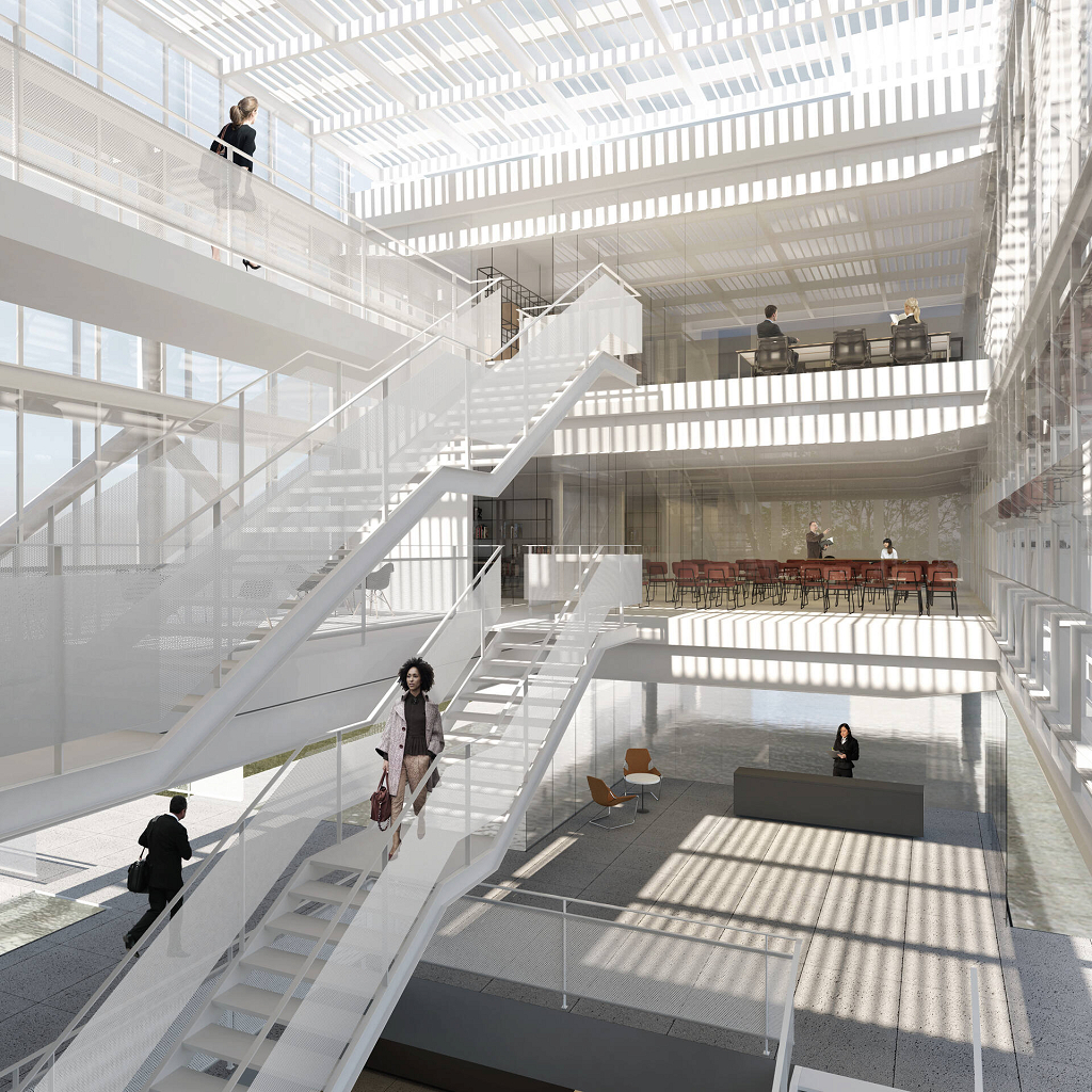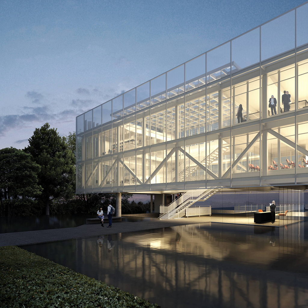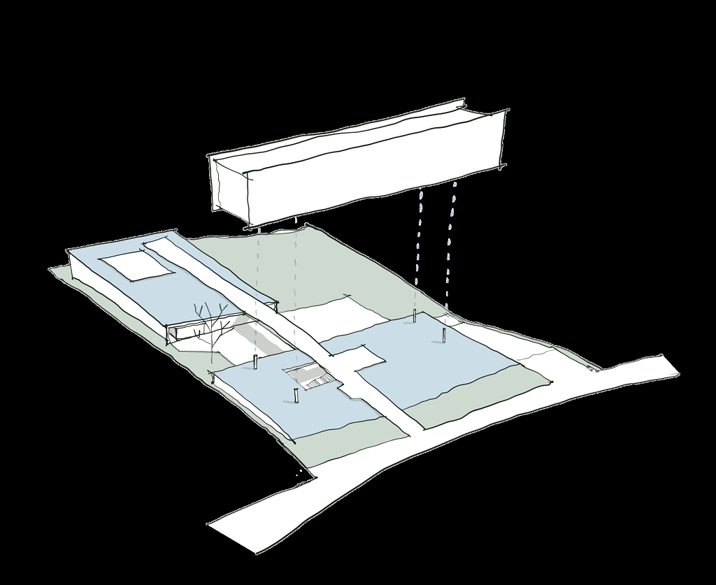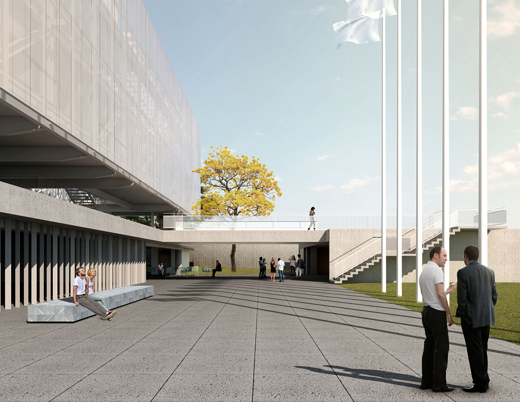 barra, esplanada e base. A barra, em estrutura metálica apoiada em pilares de concreto, flutua sobre o espelho d’água e organiza de forma racional os ambientes de trabalho. Na cota da cidade, a esplanada busca