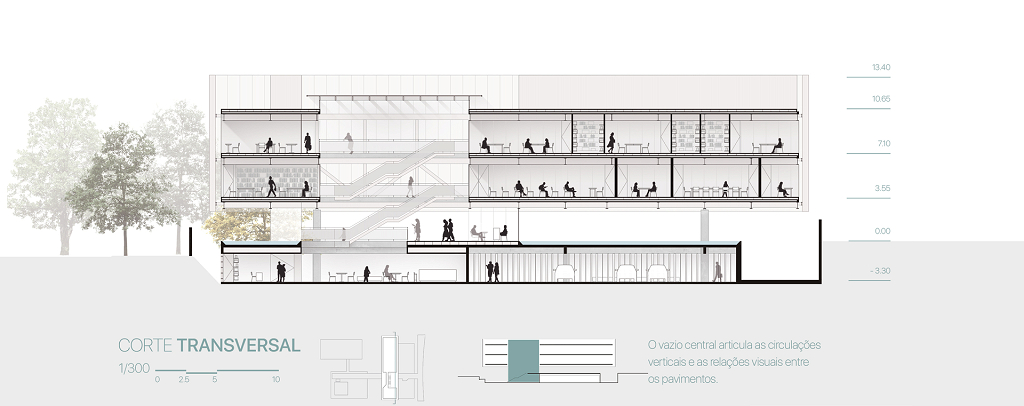 acolhe ambientes mais fechados, mas sempre articulados por pátios e vazios.