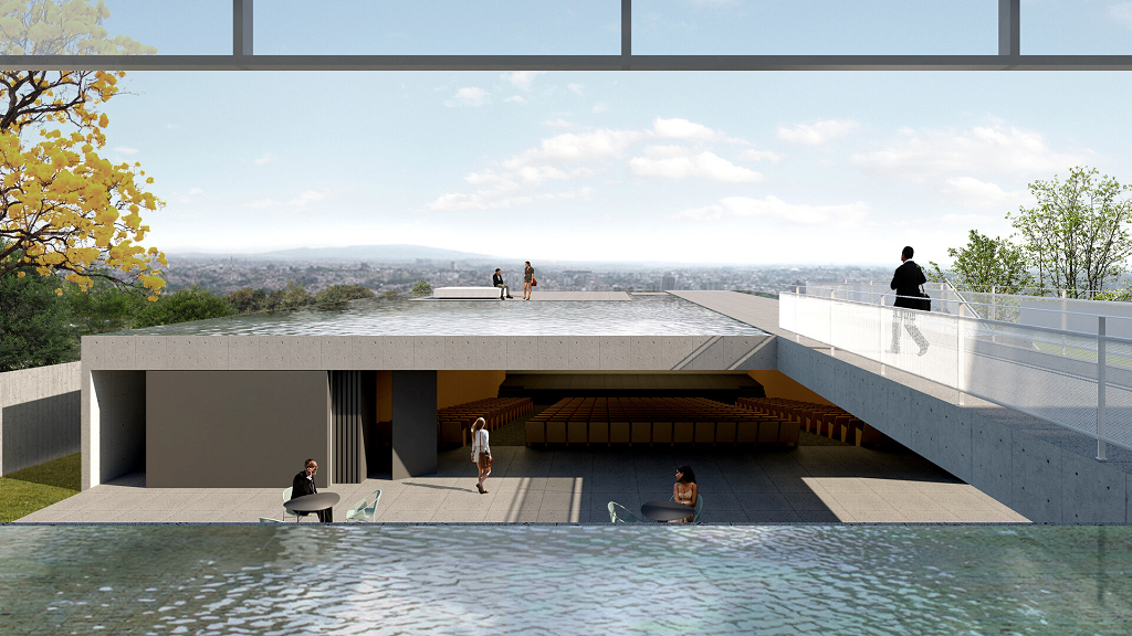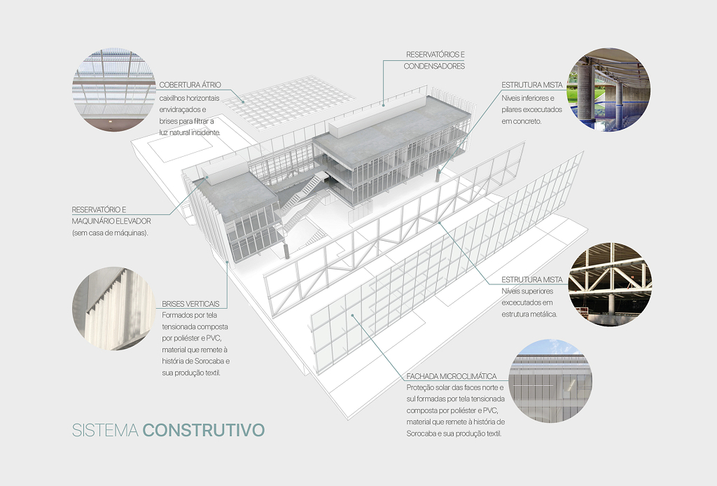 visuais generosas. A vista para a cidade e para o Morro Ipanema se mantém pública. A base, em concreto,