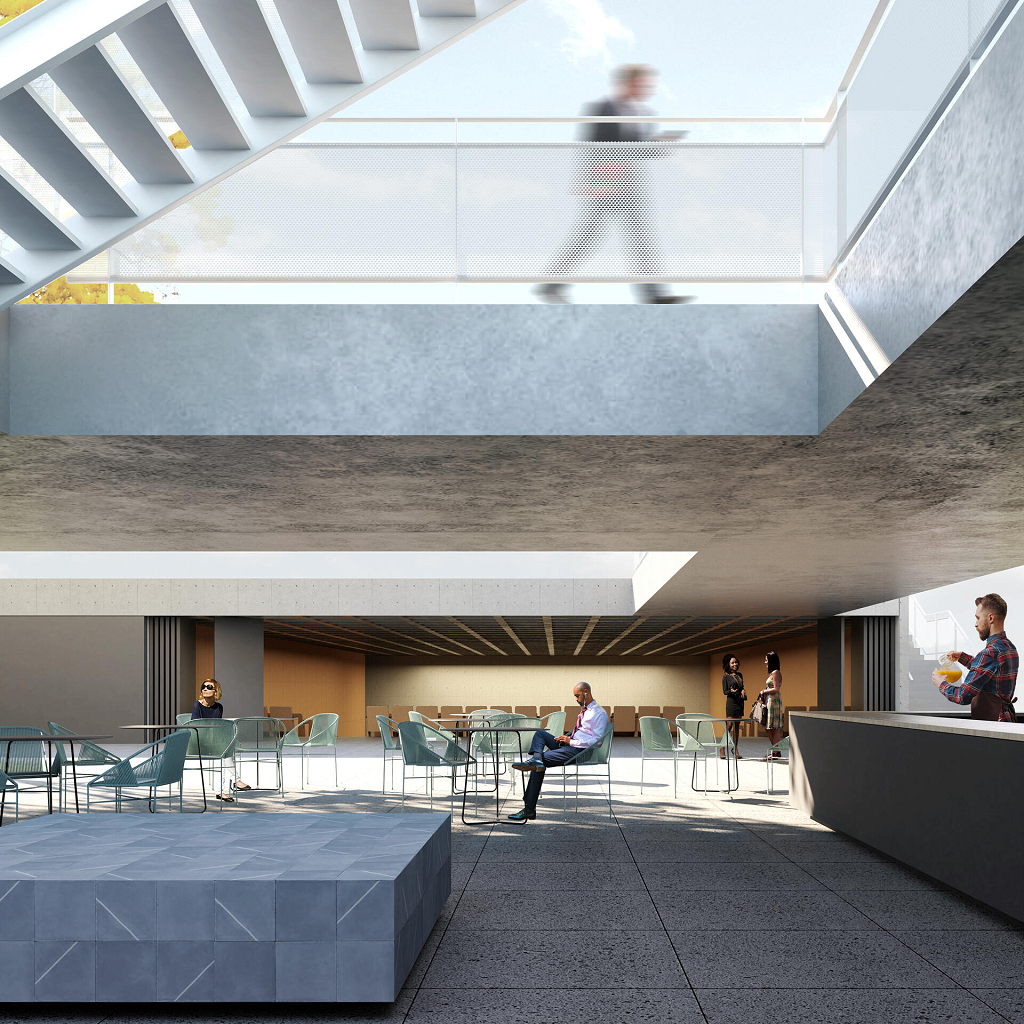 o visitante nota os programas dos níveis inferiores e superiores. Externamente, a barra se fecha em painéis de