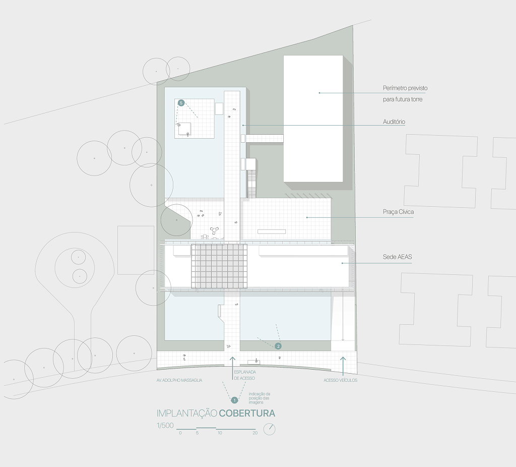A escala do pedestre é respeitada através da composição dos volumes e do posicionamento do bloco