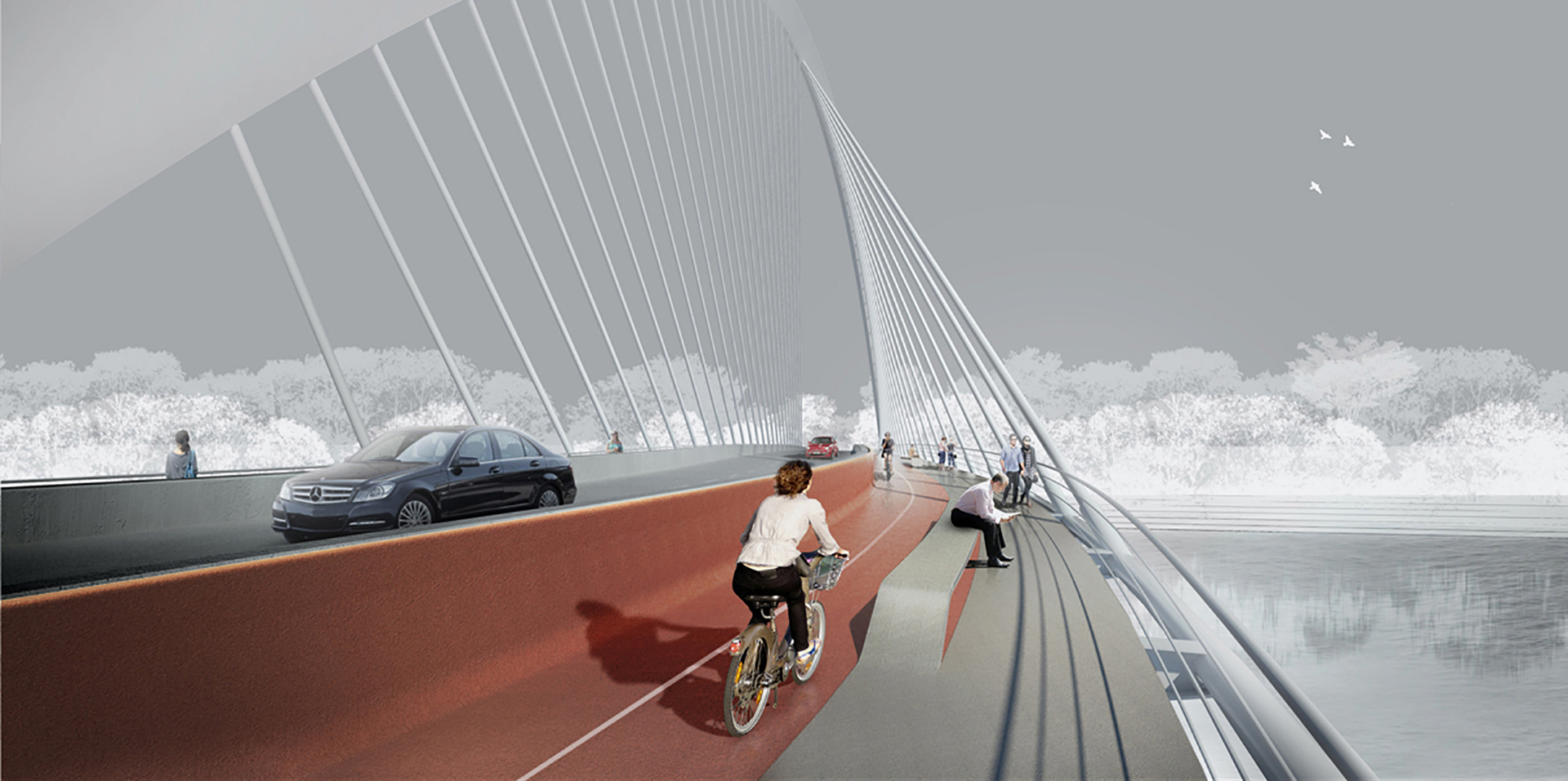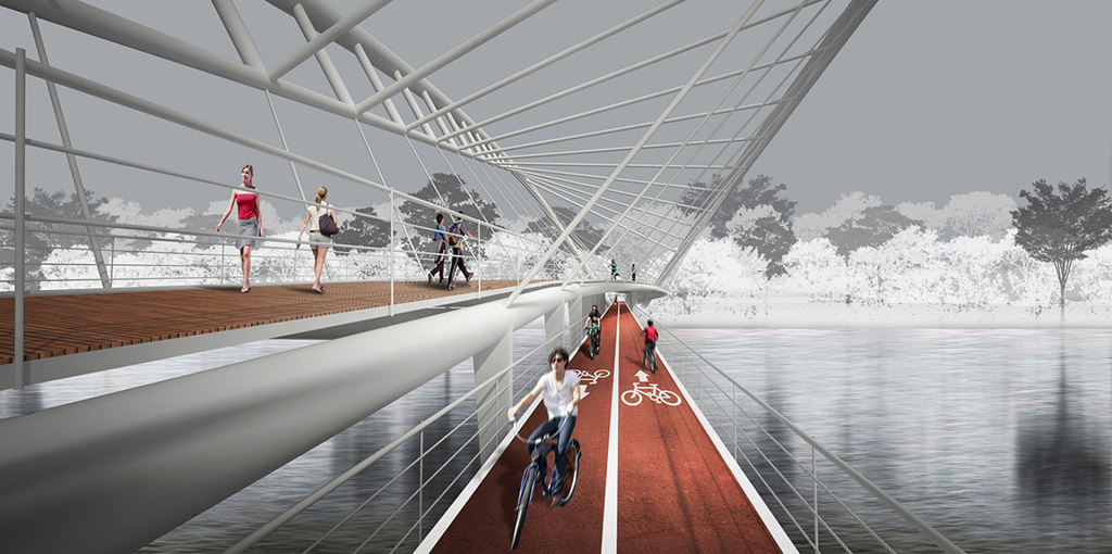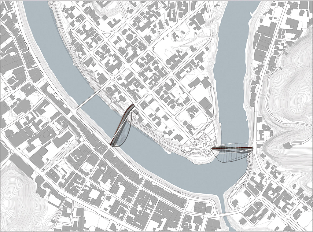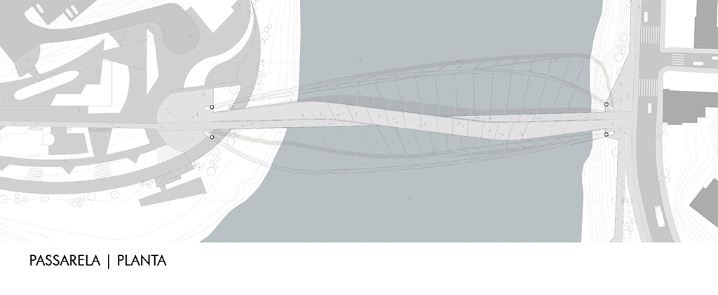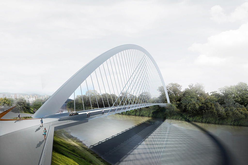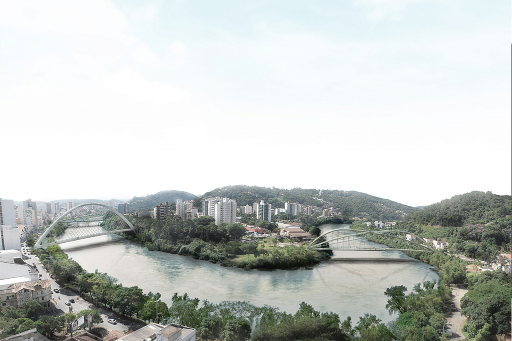 As novas ponte e passarela de Blumenau reforçam o elo entre a sua cultura e sua paisagem. A ponte costura os dois lados do Itajaí-Açú a partir do eixo urbano da Rua Chile; a passarela participa do roteiro de atrativos paisagísticos da margem esquerda, formados por caminhos peatonais e ciclísticos. Ao redefinir e fazer acessível o território lhe assinala atributos e o monumentaliza. Conforme a ocasião no ano, o metal branco pode receber cores através de iluminação específica, marcando o passar do tempo, os costumes e as festas da comunidade. A ponte e a passarela estabelecem um diálogo com a paisagem de Blumenau, criando novas referências. Serão, desde logo, novos pontos de encontro, novos sinais na paisagem da cidade. Entendendo a contemporaneidade e a premência do tema da sustentabilidade, atenção especial é dada aos pedestres e aos ciclistas. Seus caminhos são protegidos e recebem um desenho cuidadoso, para incentivar e tornar aprazível suas práticas como uma alternativa saudável e ecológica ao automóvel.