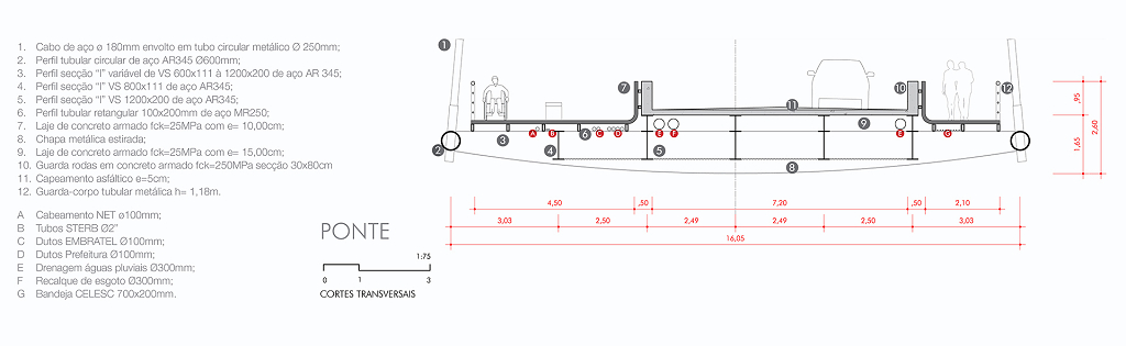 O aço é a matéria protagonista da ponte e da passarela, uma vez que os sistemas estruturais principais de ambas trabalham utilizando um grande número de peças tracionadas, cada uma a sua maneira. Os esforços caminham dos tabuleiros pelos estais e peças arqueadas no ar, até encontrarem as fundações; os arcos resolvem o problema de atravessar o rio dentro dos limites do próprio vão, ou seja, espacialmente não há nenhum tipo de elemento periférico que esteja fora das dimensões das pontes, o que explicita sua vantagem sobre outras tipologias estruturais para grandes vãos, como mastros estaiados ou penseis, que necessitam de ancoragem distante. As estruturas são formadas por peças pré-fabricadas que através das suas junções se configuram como uma presença em si; construídas com eficiência, rapidez e baixo impacto ambiental. Do ponto de vista simbólico, o arco é artifício tradicional, desenvolvido desde os romanos, para ligar duas margens sobre um vale. É também elemento já presente na iconografia de Blumenau, representada pela Ponte dos Arcos, o que nos remeteria ao sentindo de progresso da técnica.