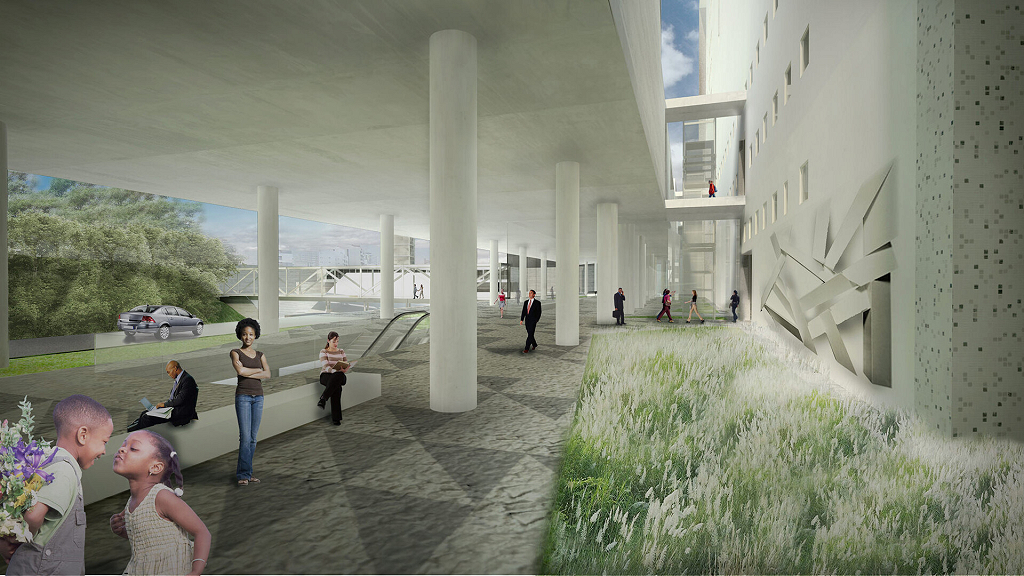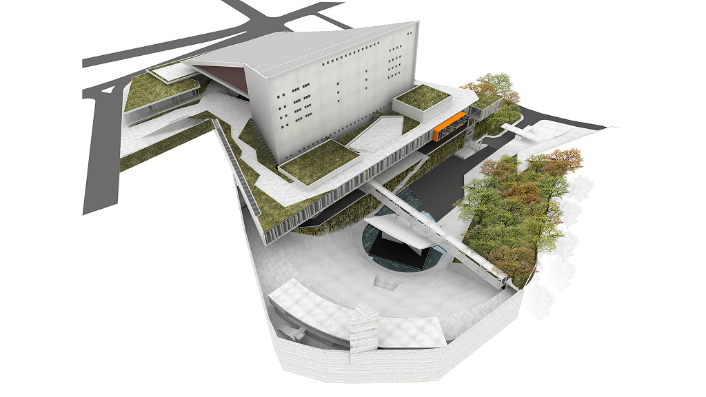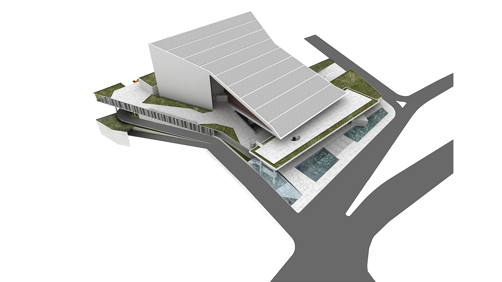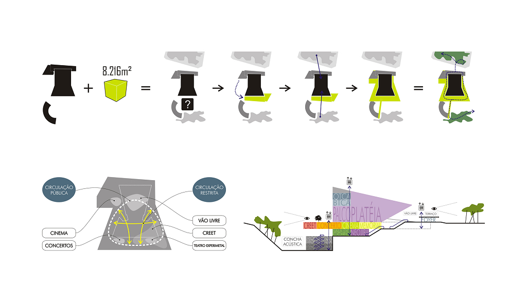 O projeto atende à recomendação de conceituar a proposta de intervenção em três níveis: REQUALIFICAÇÃO, REDISTRIBUIÇÃO e AMPLIAÇÃO. Além disso, a implantação das reformas deverá seguir um cronograma de etapas que permita o funcionamento do NTCA ininterrupto, garanta a sua exequibilidade, e proporcione um caminho de parceria, onde o programa colocado pelo edital se complete pela arquitetura. Duas estratégias são fundadoras do partido: a preservação da integralidade volumétrica do edifício pré-existente e a construção de uma nova topografia envoltória - em extensão do território da cidade - com a ordenação de seus fluxos a partir dos acessos e a comunicabilidade de suas funções. Surge uma placa que intercepta o volume do teatro e amplia, em um jardim suspenso, a cota pública urbana. Ocupam-se os espaços negativos fortalecendo a ideia de uma cobertura geradora de sombra. Fica estabelecida assim a permeabilidade física e funcional entre a construção existente e a nova que se tornam um único organismo com circuitos diferenciados: o técnico - que articula os espaços funcionais atuais com os propostos - e o público - que garante aos visitantes a fruição pelas galerias expositivas.