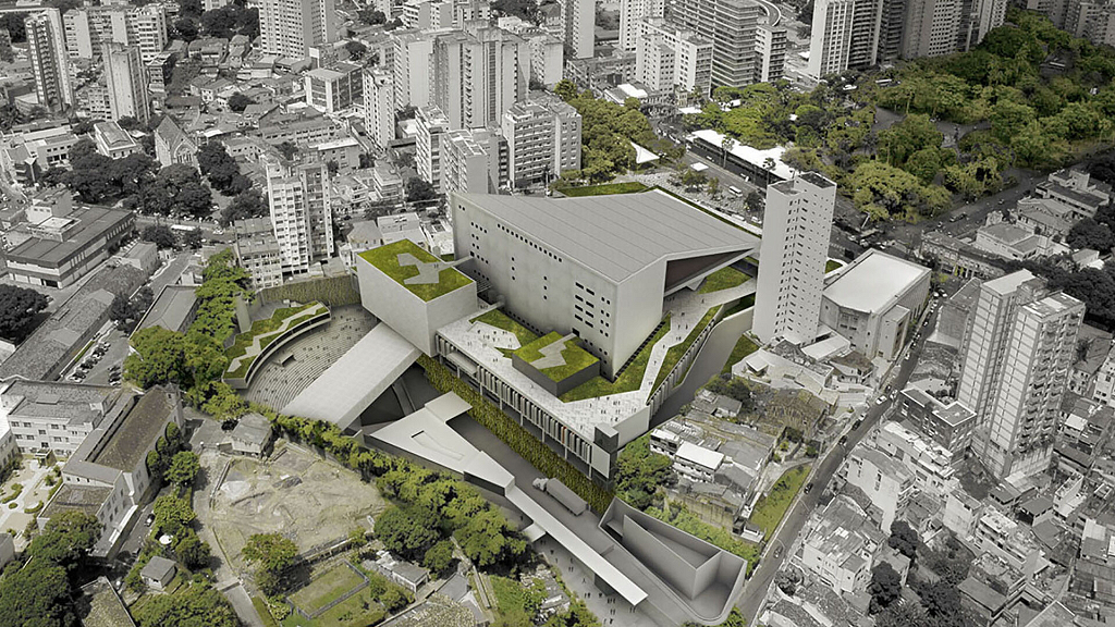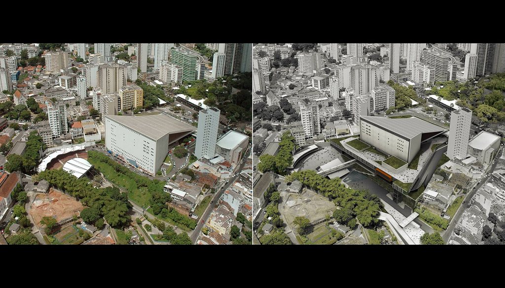 A estratégia adotada foi a de sublinhar e reafirmar a natureza e a força volumétrica do edifício atual, preservando e respeitando os valores culturais, históricos e estéticos do conjunto existente e as premissas básicas do projeto original de José Bina Fonyat Filho, na manutenção da sua integridade e do seu desenho, que resolve engenhosamente em um único volume o programa. Assim, não pareceu ser oportuno criar um novo volume, mas sim uma nova topografia que absorvesse toda a ampliação sem ferir o partido original. Adotando-se a cota do piso do Foyer como base para este novo relevo, manteve-se apenas este como um pavilhão destacado, conforme o projeto inicial previa.