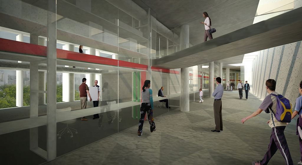 A criação de dois circuitos independentes, funcional e público, faz a integração entre a nova ampliação e o edifício existente, estabelecendo um diálogo coerente e equilibrado que potencialize e aperfeiçoe a utilização do espaço físico do complexo.
